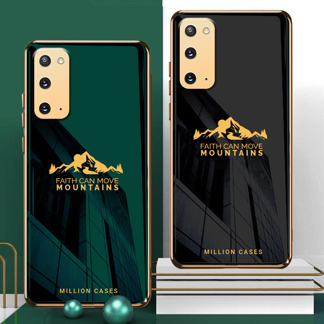 An Attractive electroplating glass case with a popular mountain theme that features a motivational quote "FAITH CAN MOVE MOUNTAINS" for your premium smartphone. The frame of the phone case is galvanized around the camera lens and the border, which makes it attractive.