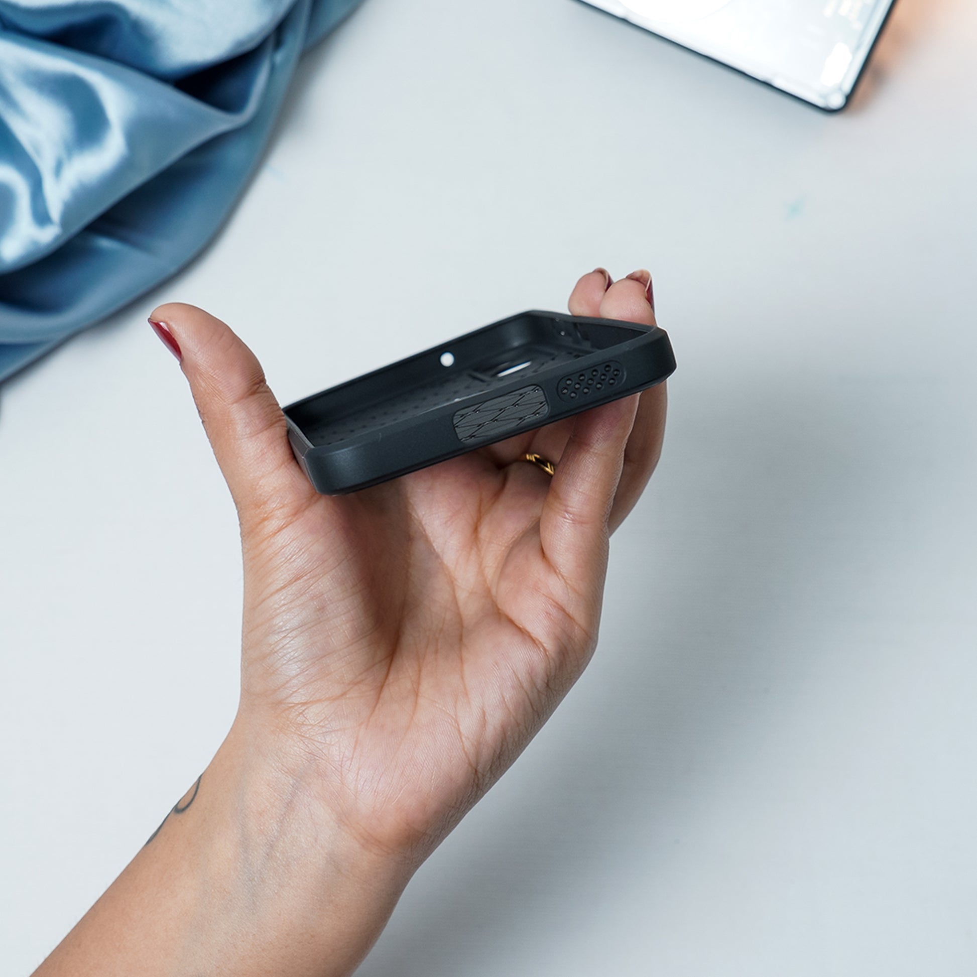 • Raised edges to protect the mobile and keep mobile uplifted from the surface.